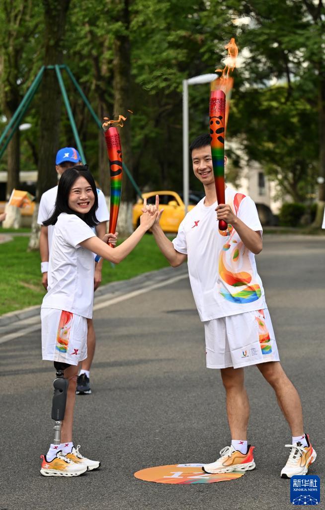 7月20日,火炬手郑子昕(右)与牛钰在火炬传递中交接。新华社