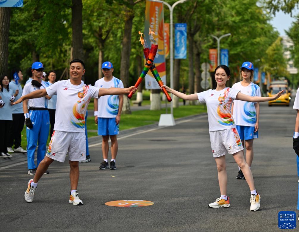 7月20日,火炬手李悦琪(右)与尹蕾在火炬传递中交接。新华社