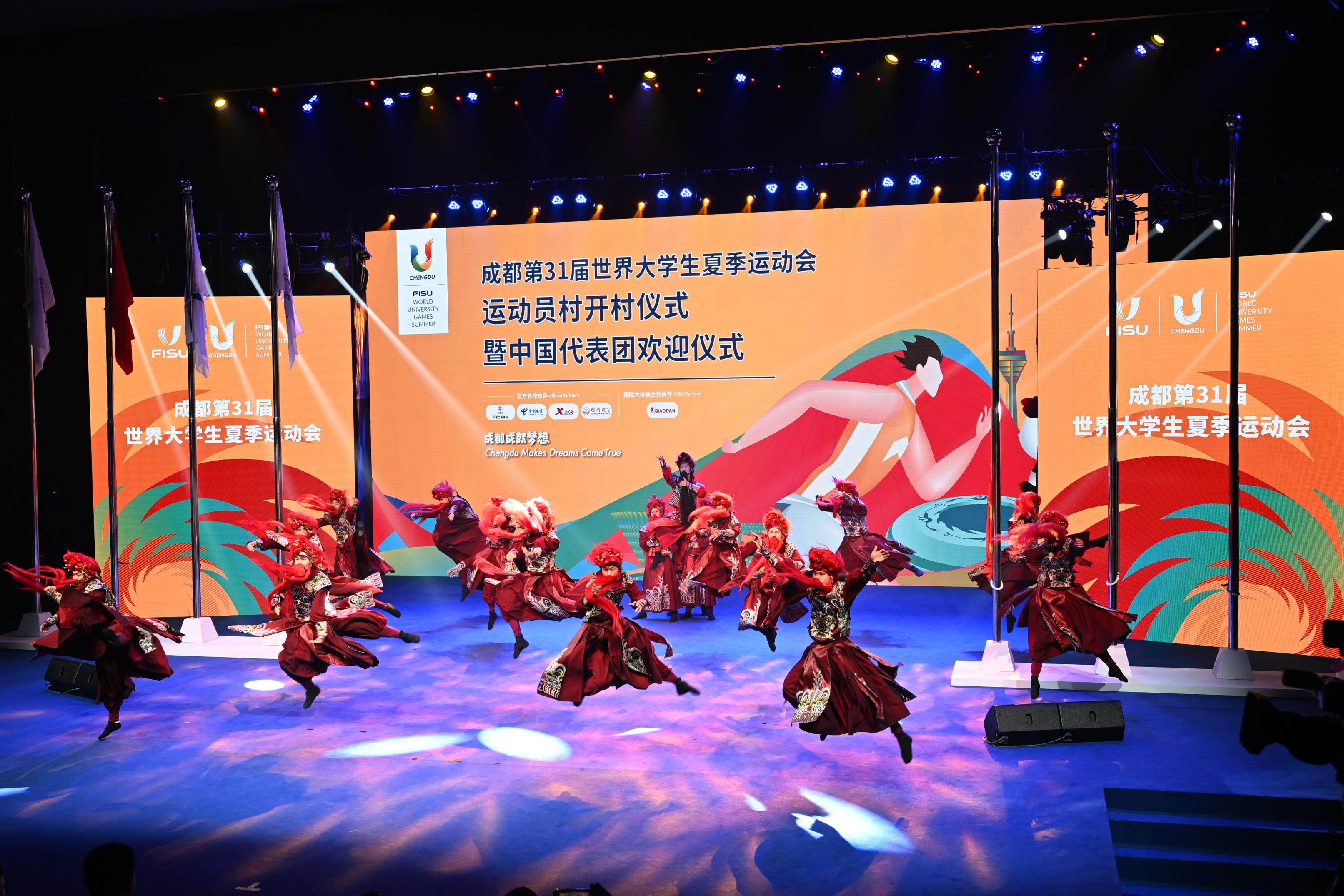 7月22日,成都第31届世界大学生夏季运动会运动员村(简称“成都大运村”)正式开村,并为首支入住的代表团——中国大学生体育代表团举行了欢迎仪式。图为开村仪式上的文艺演出。京报网