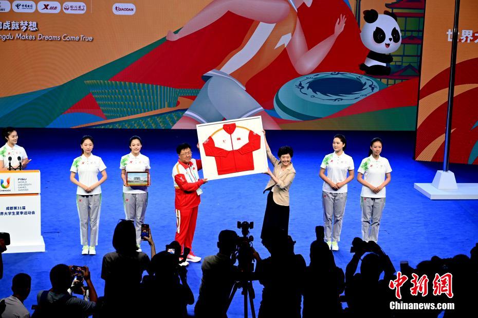 中国大学生体育代表团向成都大运村赠送礼物。中新网