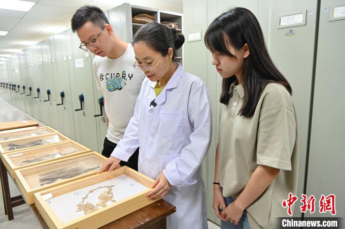 目前,香港青大学生李兆天与澳门大学生高莹来到华南国家植物园开展实习活动,在老师的指导下参与植物标本制作、植物标本数字化、植物标本入库整理等工作。图为7月24日,华南国家植物园标本馆工作人员汤银珠(中)向港澳大学生介绍该馆保存年代最久远的植物标本。