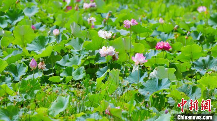 时值盛夏,中国多地景区荷花竞相绽放,呈现出“接天莲叶无穷碧,映日荷花别样红”的美丽景象。图为在新疆阿克苏地区库车市墩阔坦镇荷花村,荷塘的荷花竞相开放,千姿百态。中新网