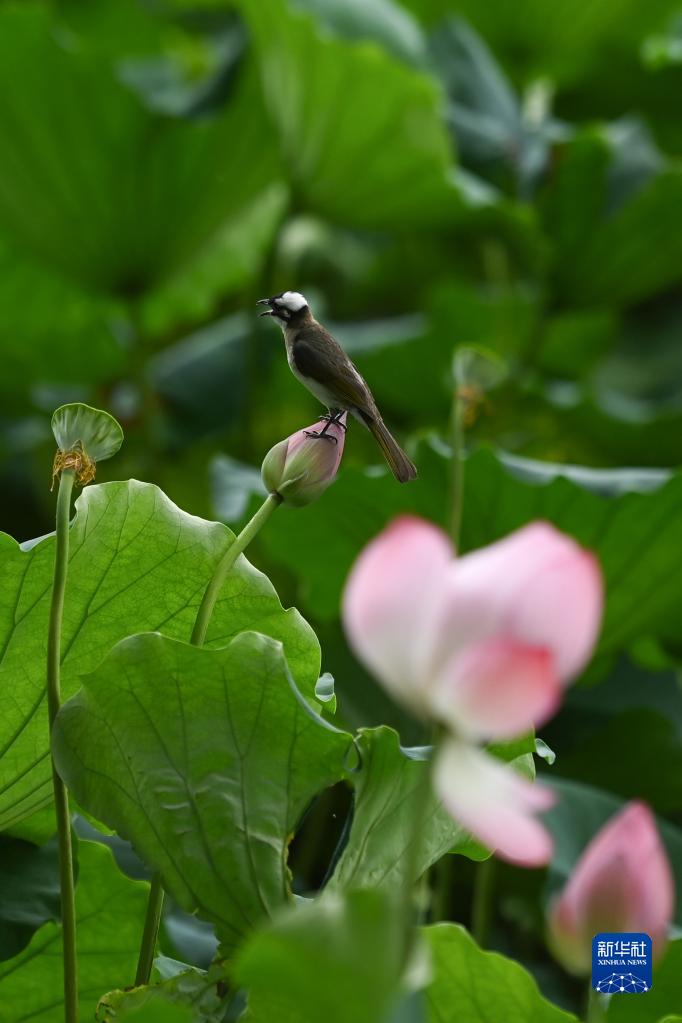 7月25日,一只白头鹎站立在西湖景区一朵待放的荷花上。新华社