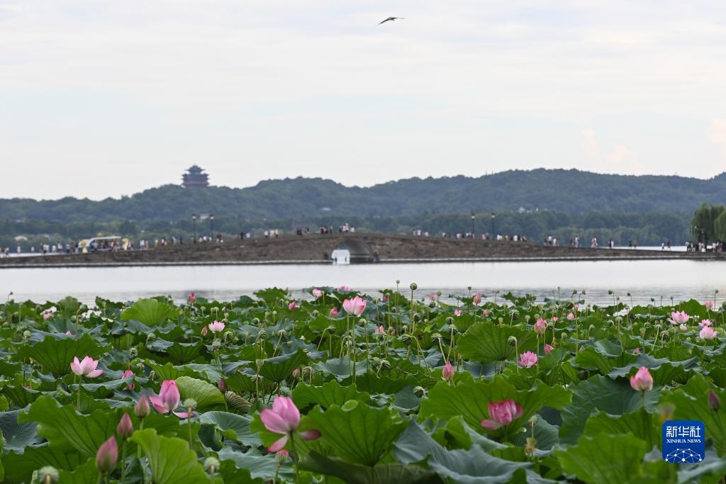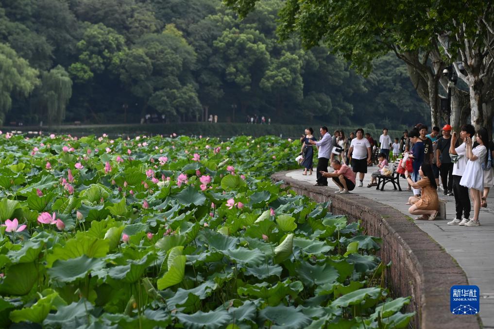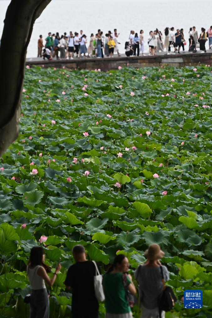 7月25日,游客在杭州西湖景区赏荷游览。新华社