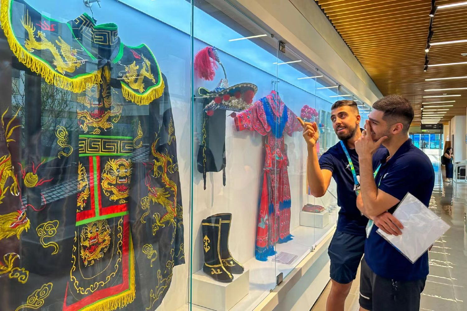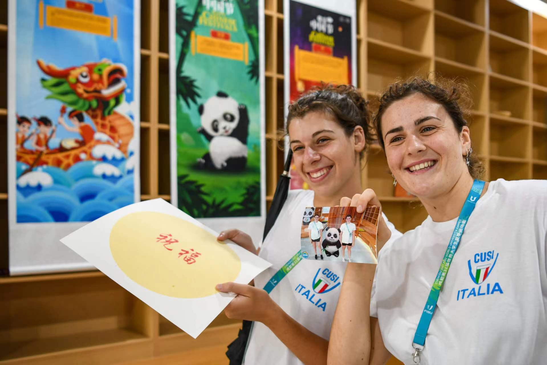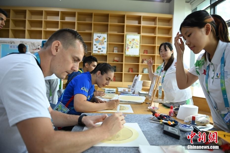 大运村既是代表团和运动员在成都的家,也是展示城市文化的重要窗口。在赛事运行期间,大运村里每天都将推出一系列文化活动,包括主题晚会、特色展览、中国传统文化体验等,让世界青年在大运村里就能感受到浓浓的中华文化和巴蜀韵味。图为两位意大利水球运动员体验“汉语桥”活动。上海劳动报·劳动观察