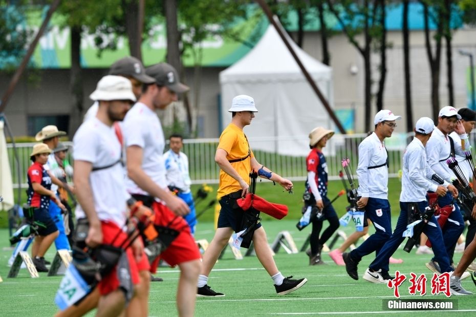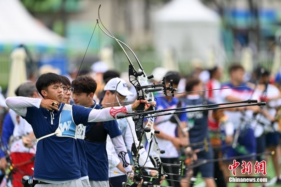 7月27日,成都第31届世界大学生夏季运动会射箭比赛在成都现代五项赛事中心马术体育场搭箭开弓。据悉,成都大运会射箭比赛有27支男队和24支女队参赛。图为参赛选手进行男子反曲弓团体淘汰赛。中新网