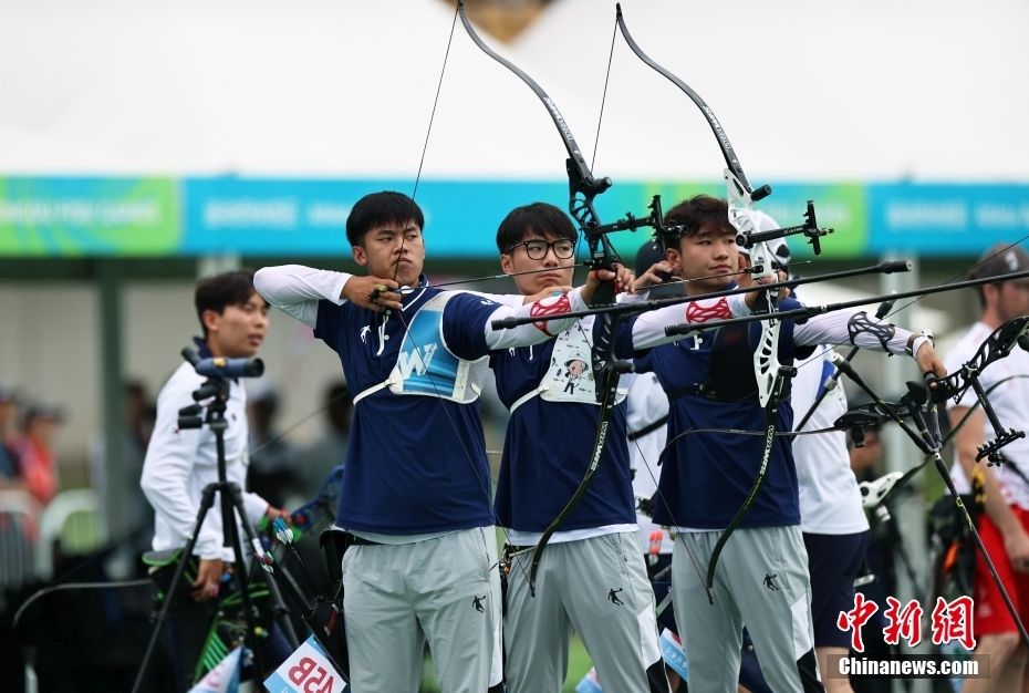 参赛选手进行男子反曲弓团体淘汰赛。中新网