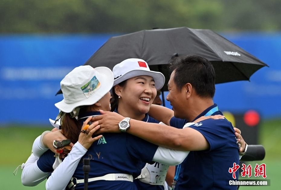 中国队选手李新鑫(中)在女子反曲弓团体半决赛后庆祝晋级决赛。中新网