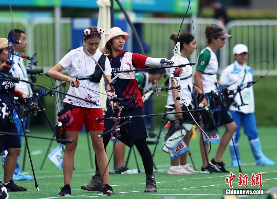美籍华裔选手吴沛琳(中,红衣)在女子反曲弓团体淘汰赛比赛中。中新网