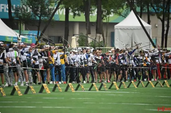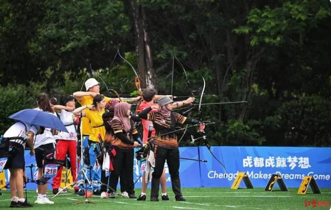 7月27日,成都第31届世界大学生夏季运动会射箭比赛在成都现代五项赛事中心马术体育场搭箭开弓。据悉,成都大运会射箭比赛有27支男队和24支女队参赛。