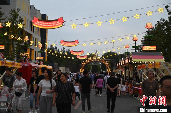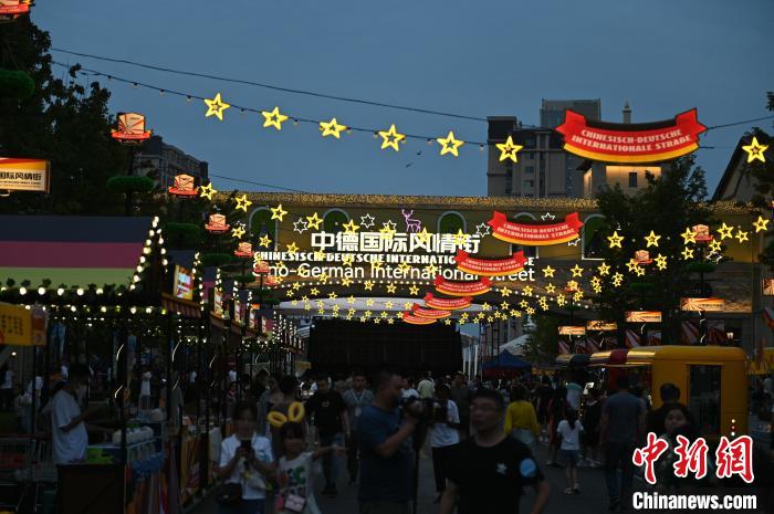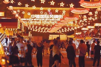 中德国际风情街的经营内容主要分为两部分。第一部分是商业街的商户,以特色餐饮、零售和社区型商业为主,有纯德国风格的酒吧、德式、意式、土耳其风格餐厅等。第二部分是星星市集,在每年7月至10月,每个周五、周六和周日的晚17时30分至21时举办。图为市民游览星星市集。中新网