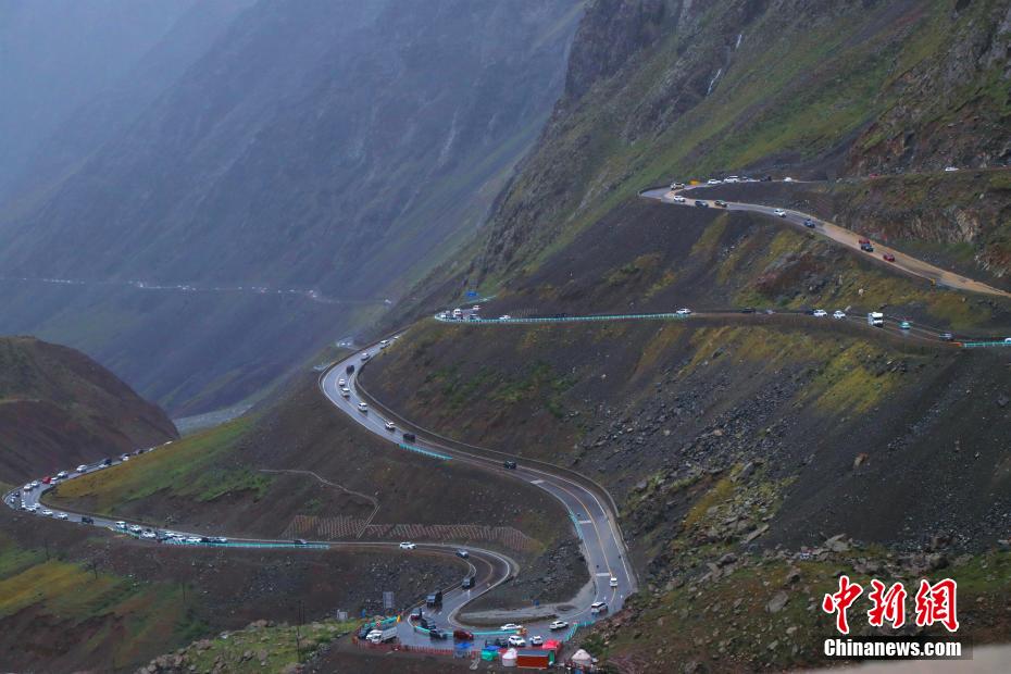 下雨天,蜿蜒的独库公路上车辆往来不绝。中新网