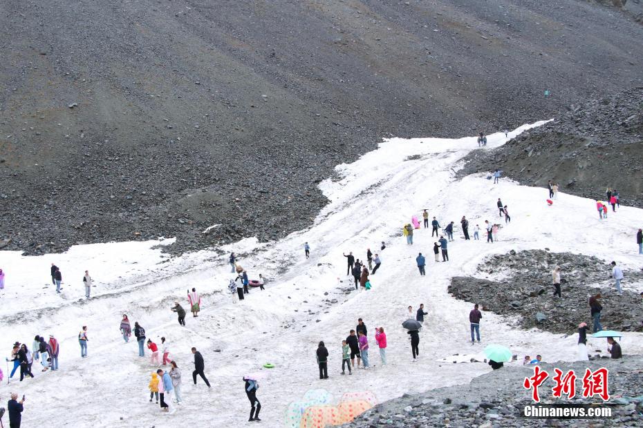 8月初,游客在独库公路边上体验滑雪。中新网