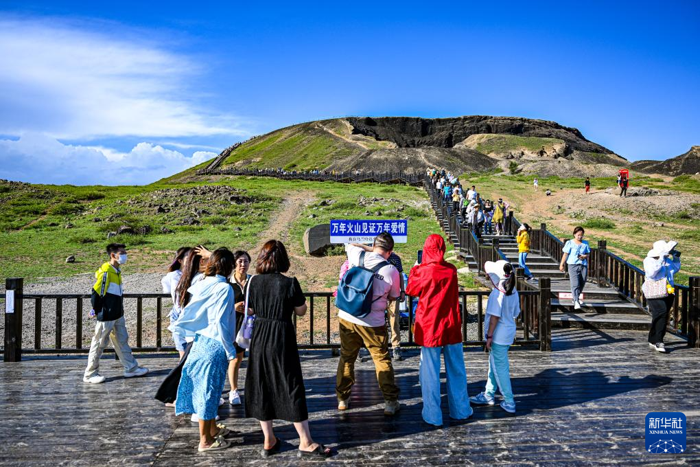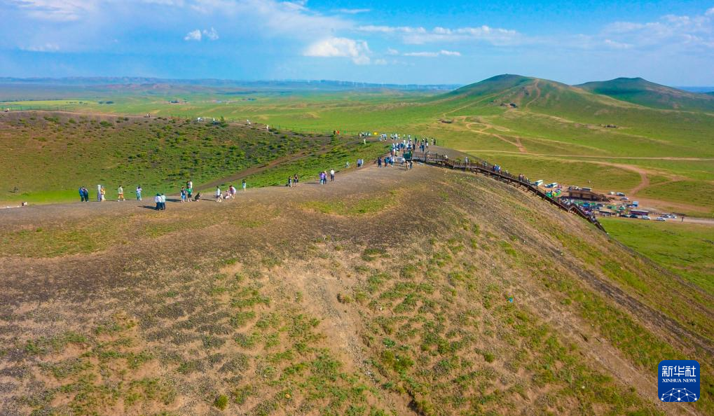 游客在乌兰察布市察哈尔右翼后旗草原上的火山上游览。新华社
