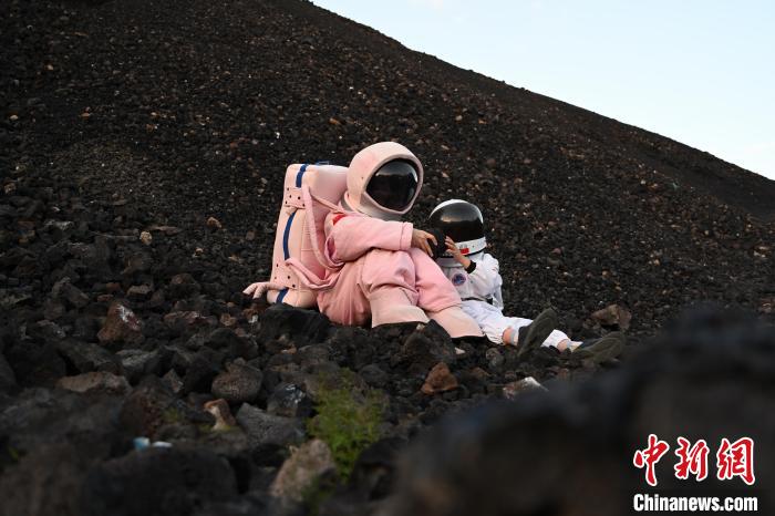 一对情侣身着“宇航服”,在乌兰哈达火山群中游玩。中新网