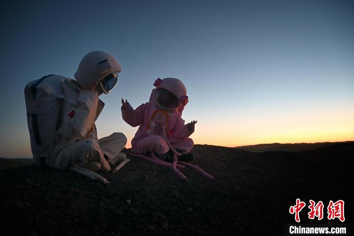 一对“宇航员”情侣在乌兰哈达火山群中拍照。中新网