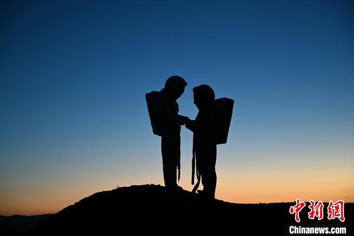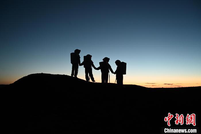 8月12日,身着“宇航服”游客在乌兰哈达火山群中看夕阳。中新网
