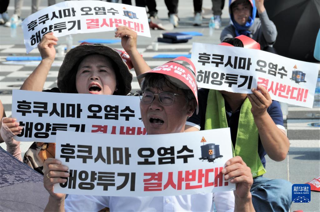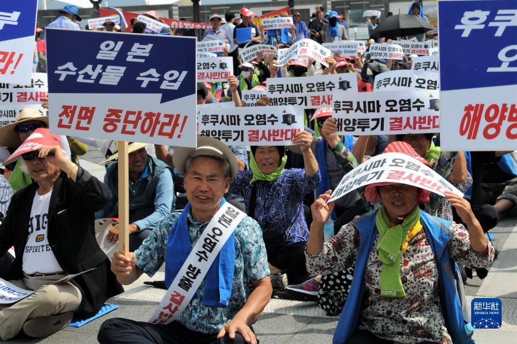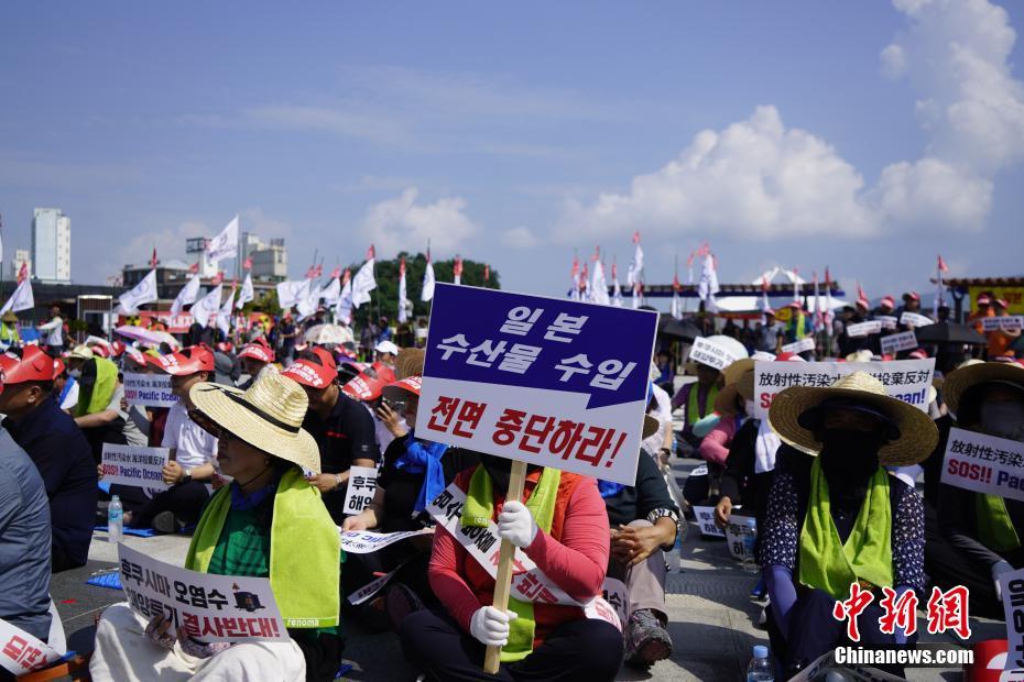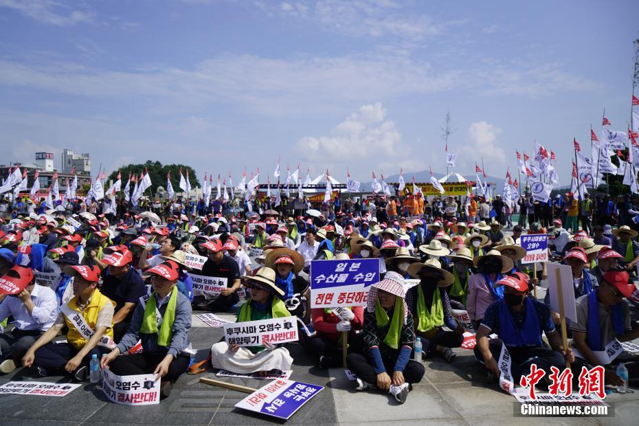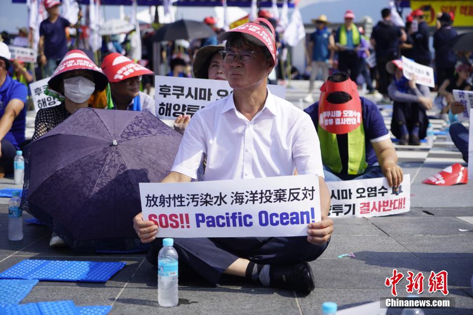 8月16日,韩国全国渔民会总联盟的渔民在全罗南道高兴郡沿海一带举行集会,约1500名渔民在码头席地示威,抗议日本核污染水排海。