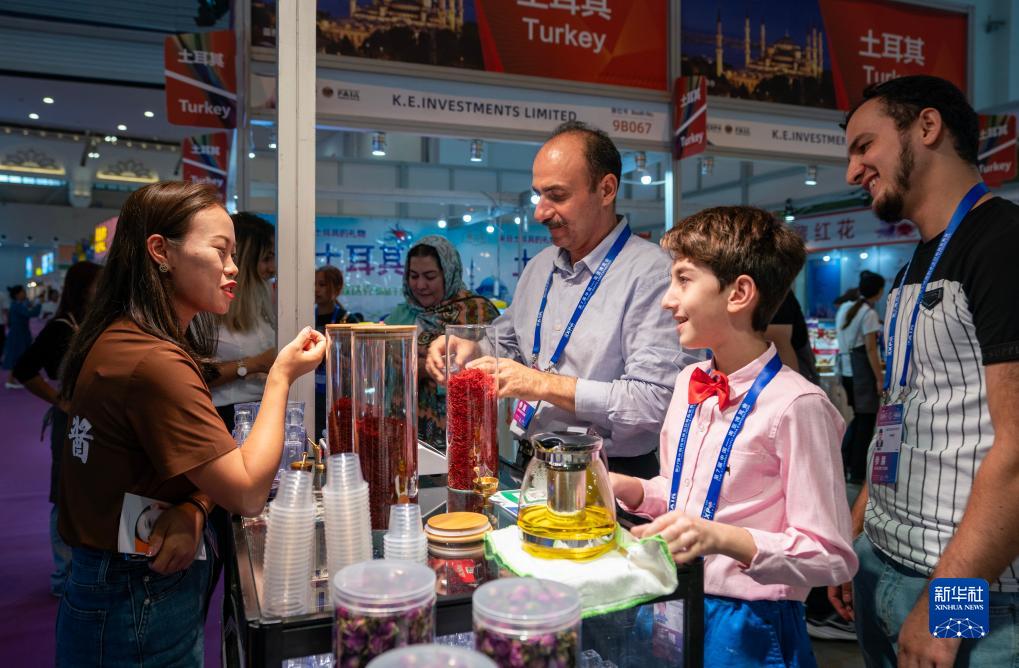 来自伊朗的参展商向参观者(左)介绍藏红花。新华社