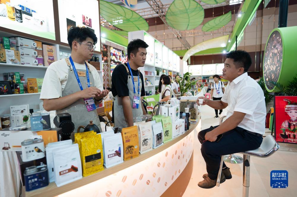来自中国云南保山的参展商向参观者介绍咖啡产品。新华社