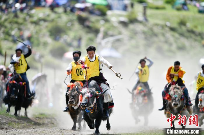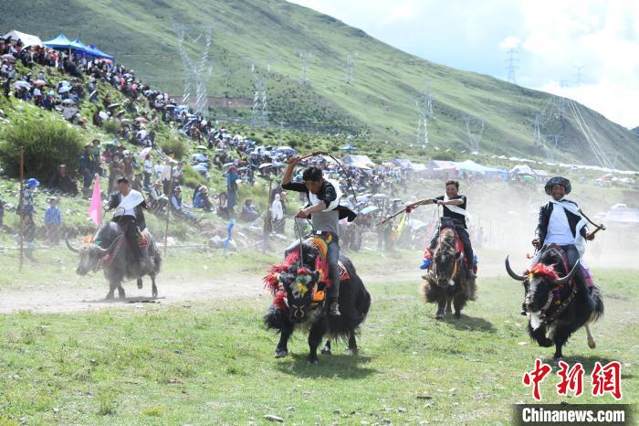 8月16日,西藏拉萨市墨竹工卡县扎西岗乡斯布村村民身着节日盛装,开展赛牦牛活动,欢度雪顿节。中新网