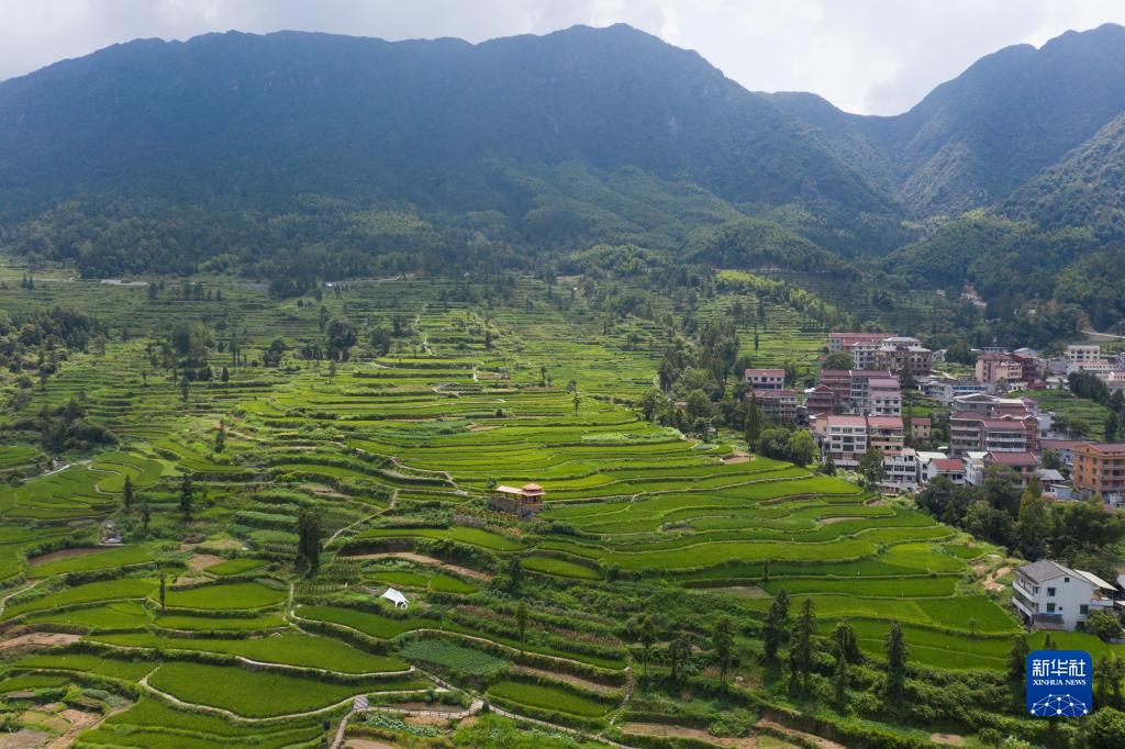 近年来,浙江省丽水市青田县金融发展中心联合各个金融机构优化配套乡村振兴金融服务,重点支持涉农龙头企业及特色种养殖产业,充分发挥金融助力的乘积效应,助力乡村振兴。 方山乡位于丽水市青田县东南部,是田鱼之乡、生态之乡,拥有全球重要农业文化遗产青田稻鱼共生系统。方山乡全乡稻鱼种养总面积4000亩,打造稻鱼共生主导产业示范基地13家,2022年稻鱼产业产值4500多万元(人民币,下同)。图为8月17日,空中俯瞰青田县方山乡梯田,这里也是稻鱼共生系统的核心保护区。