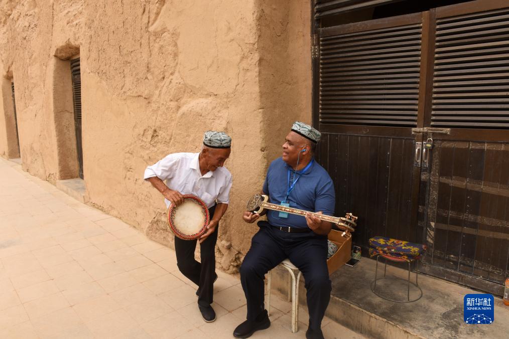 8月14日至19日,受中国文化和旅游部邀请,斐济共和国、蒙古国、塞舌尔共和国等9个国家的十余位驻华外交官走进新疆,开展了为期6天的“发现中国之美”新疆参访交流活动。 图为在柏孜克里克千佛洞,参访团成员与当地居民共奏一曲(8月15日摄)。新华社