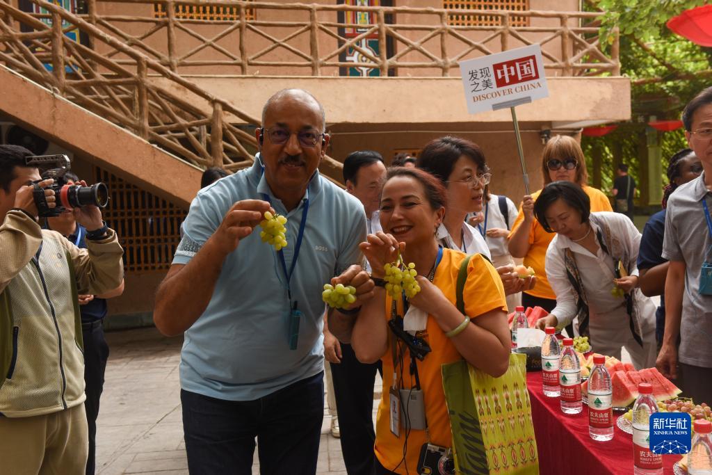 在吐鲁番葡萄沟景区一处民宿家访点,古朴精致的传统民居让参访团成员赞不绝口,他们与民宿主人坐炕话家常,感受当地居民勤劳质朴和追求美好生活的精神面貌。突尼斯共和国驻华大使馆参赞本·亚古·阿代勒十分钟爱这里的美食。他说:“不管是在百姓家中还是城市街道,我都能感到新疆人民的乐观豁达、和善友好,很高兴受到邀请在这里做客,这里风景很美,但是居民的心更美,他们的好客精神让我感到温暖,我已经与他们成为朋友。”图为在新疆吐鲁番葡萄沟景区,参访团成员展示新疆瓜果(8月15日摄)。新华社
