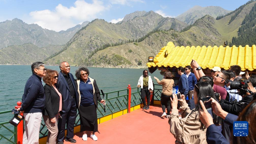 新疆天山天池景区在2013年被列入联合国教科文组织世界遗产名录,8月如画的风景令参访团成员沉醉不已。塞舌尔共和国驻华大使安妮·拉福蒂纳说:“天池是我见过世界上最美的地方之一,我愿做新疆旅游的推广大使,向身边朋友推荐新疆风光,也期待未来两国多一些交流,让更多塞舌尔游客来到新疆。”新疆的瓜果同样给安妮·拉福蒂纳留下深刻印象,“我从来没有吃过如此甜蜜的食物,这是我一生最难忘的回忆之一”。图为参访团成员乘船参观天山天池景区并合影留念(8月16日摄)。新华社