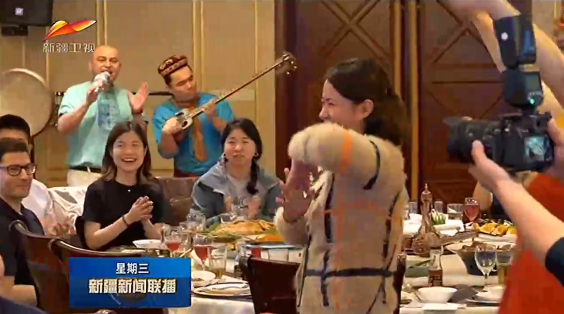 参访团成员跟随着手鼓的旋律跳起了新疆舞。新疆卫视视频截图
