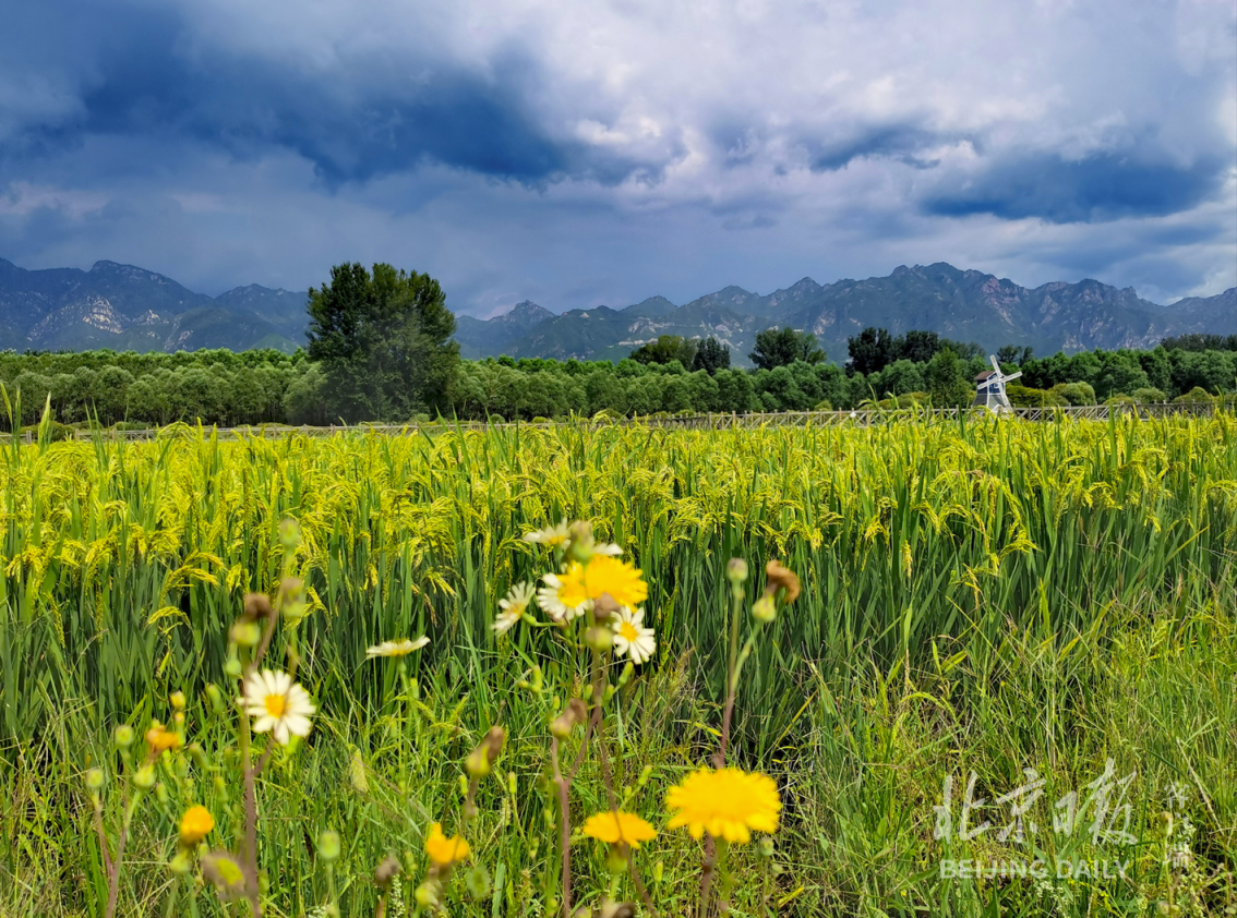 金黄色的水稻、火红的高粱、红彤彤的海棠果、秋梨黄,还有花生、香芋、金枣、南瓜......丰收的九月,果实累累,一年中最美的收获季节到来,中国各地一片丰收美景,吸引不少游人前来欣赏游玩。图为8月26日,北京延庆阪泉体育公园迎来骑行、散步、休闲的游人们,园内百亩“网红稻田”开始泛黄,在远山蓝天白云的映衬下,构成一幅美不胜收的画卷。“北京日报”客户端