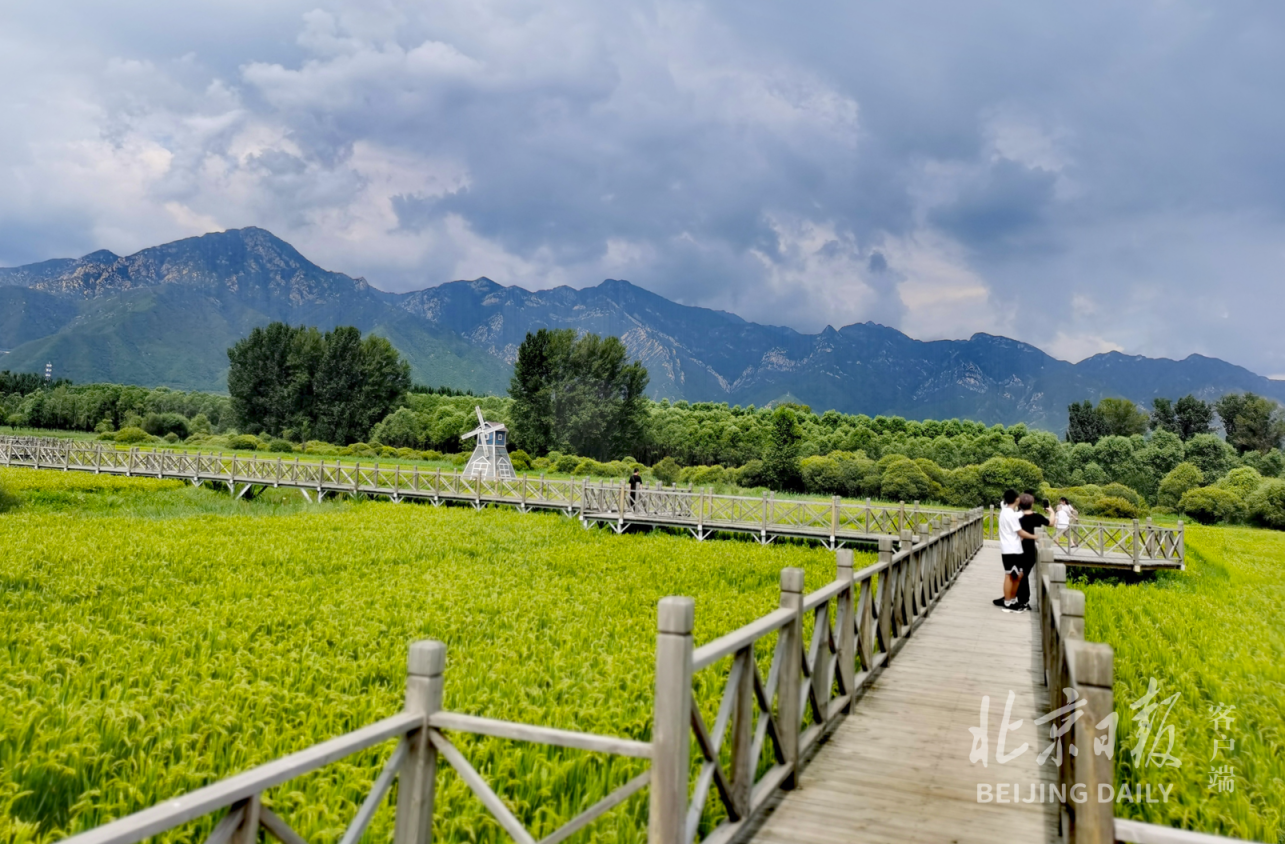 正值秋日好风光,顺着骑游绿道来到公园西北端,眼前是一大片稻田,一条木栈道在稻田中蜿蜒,美不胜收。游客们有的沿着木栈道在稻田中穿行、拍照,有的在园内骑行,欣赏水源涵养林等生态景观,流连忘返。“北京日报”客户端