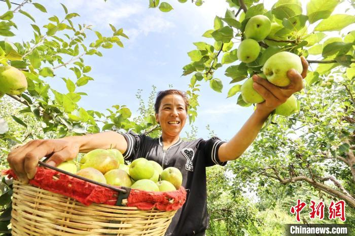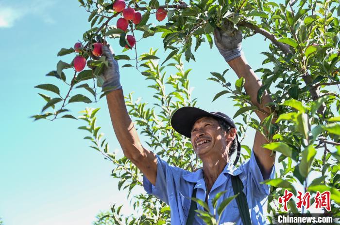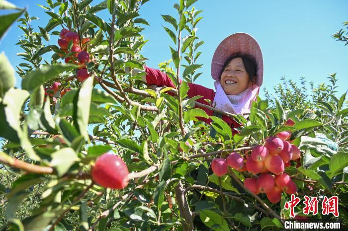 8月26日,在新疆昌吉回族自治州呼图壁县五工台镇龙王庙村海棠果种植基地,农户正在采摘海棠果。中新网