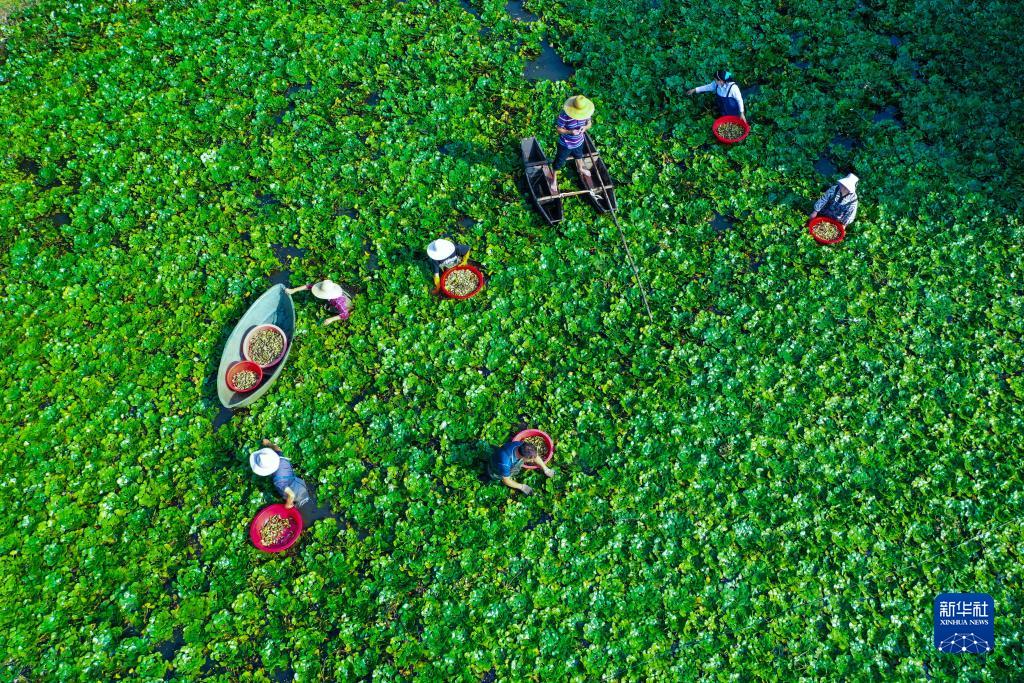 8月24日,河南省信阳市光山县司马光小镇升辉合作社农民在采摘菱角(无人机照片)。眼下,各地菱角陆续进入采摘期,农民加紧采摘,确保新鲜的菱角及时供应市场。新华社