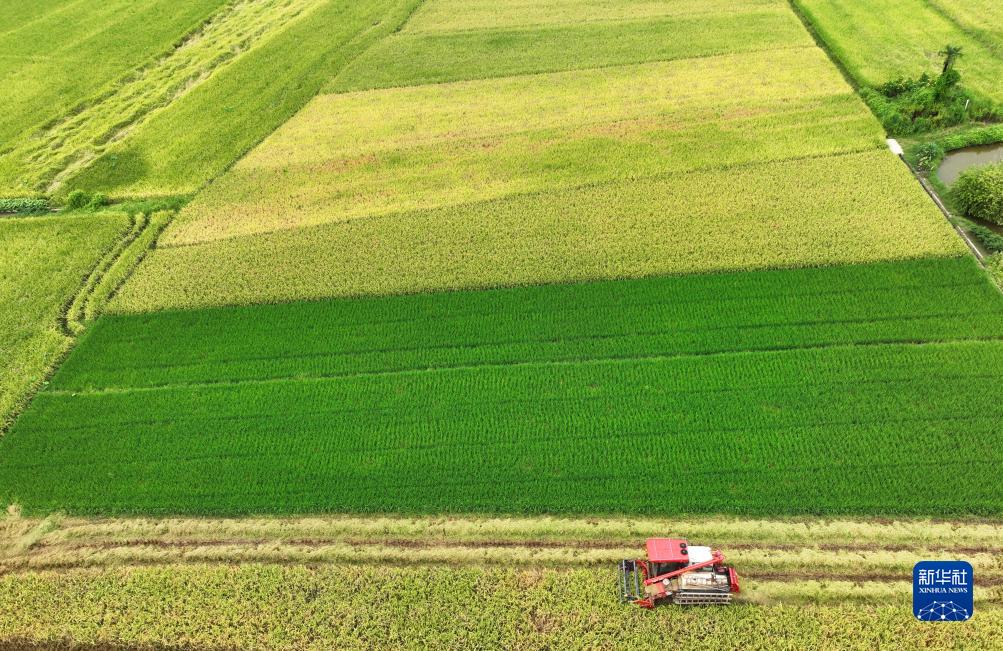 8月27日,在湖南省衡阳市衡阳县台源镇,农机手驾驶收割机在收割稻谷(无人机照片)。新华社