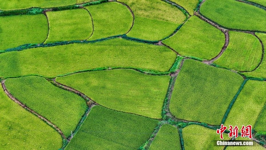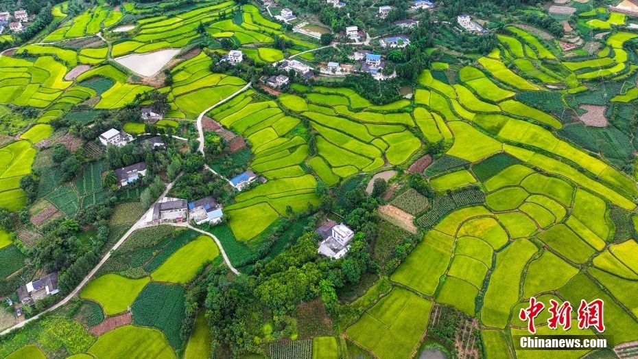 8月27日,四川省苍溪县百利镇水稻日渐成熟,丰收在望。田埂蜿蜒,一块块稻田和散布的村庄拼接成大地天然“调色板”,美丽而壮阔。中新网