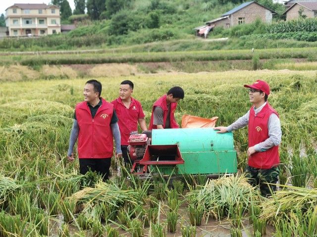 近日,四川富顺县李桥镇小桥村稻田里,连片的金黄色水稻一望无际,沉甸甸的稻穗挂满枝头,微风拂过,一股浓郁的稻香扑面而来。图为志愿者们帮忙收割稻谷。四川经济网