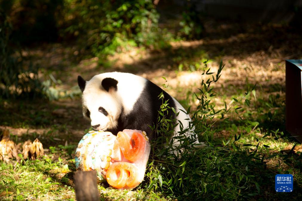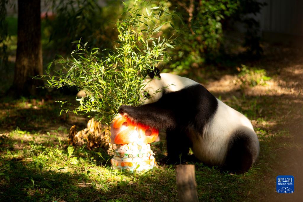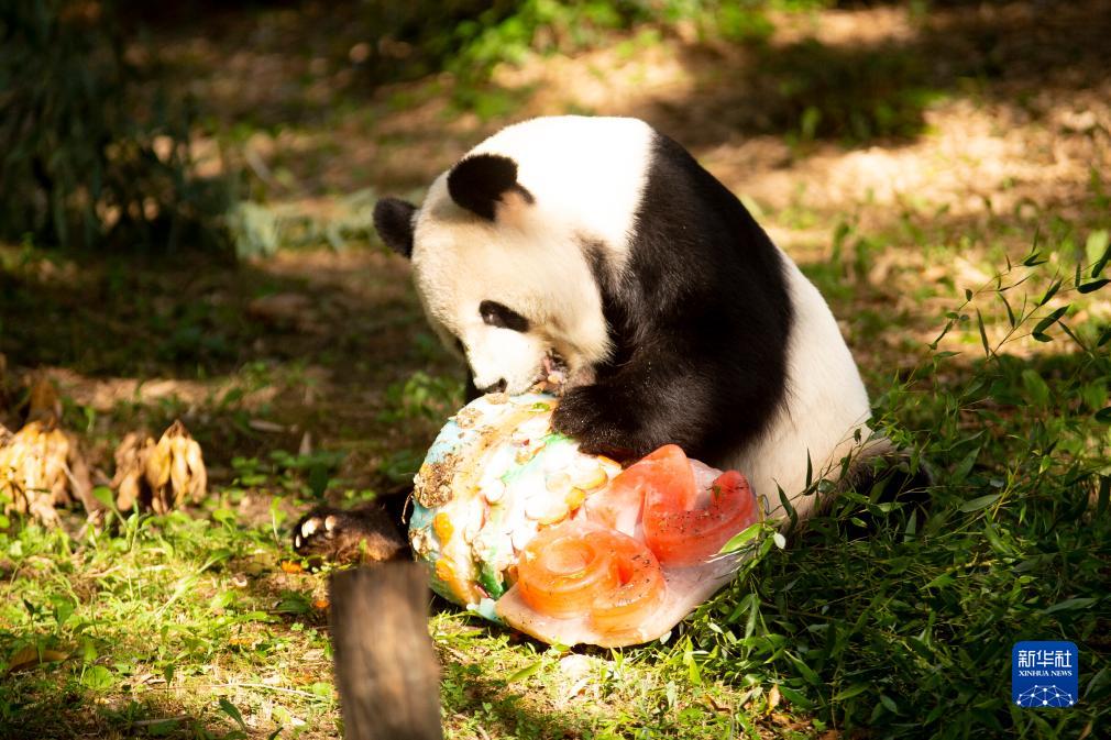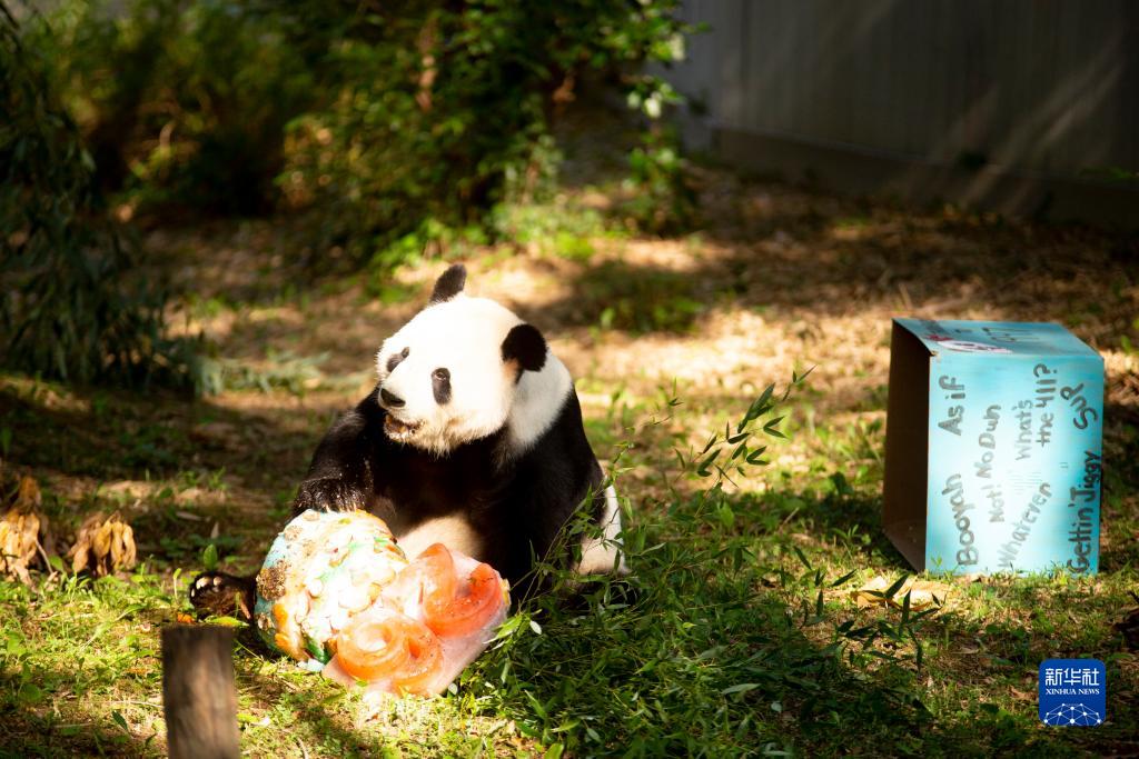 8月27日,大熊猫“添添”在美国首都华盛顿史密森学会国家动物园享用生日蛋糕。新华社
