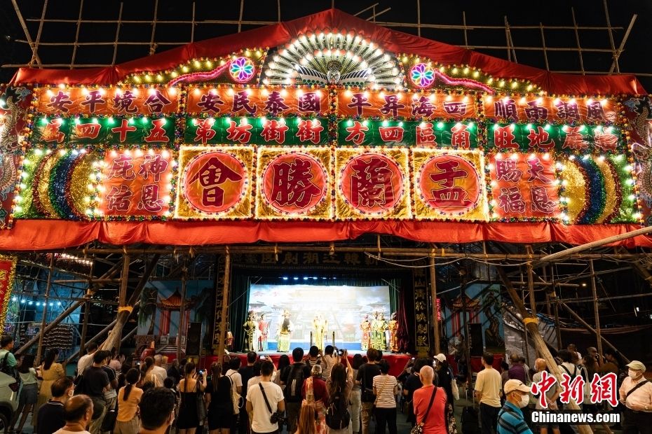8月30日,中国农历七月十五“中元节”,香港特别行政区市民在九龙佐治五世公园内旅港潮州人举办的“盂兰胜会”上欣赏“神功戏”,度过传统农历节日。