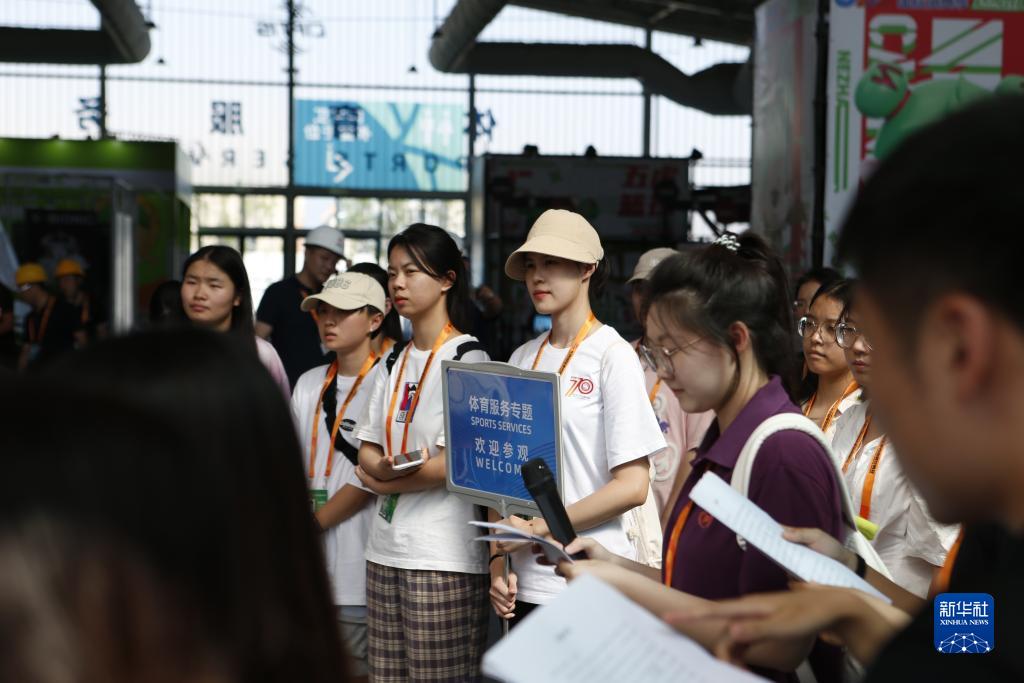 8月31日,在服贸会首钢园区体育服务专题展区内,来自北京体育大学的服贸会志愿者在参加培训。新华社