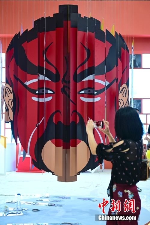 8月31日,媒体记者在首钢园展区拍摄京剧脸谱装置。中新网