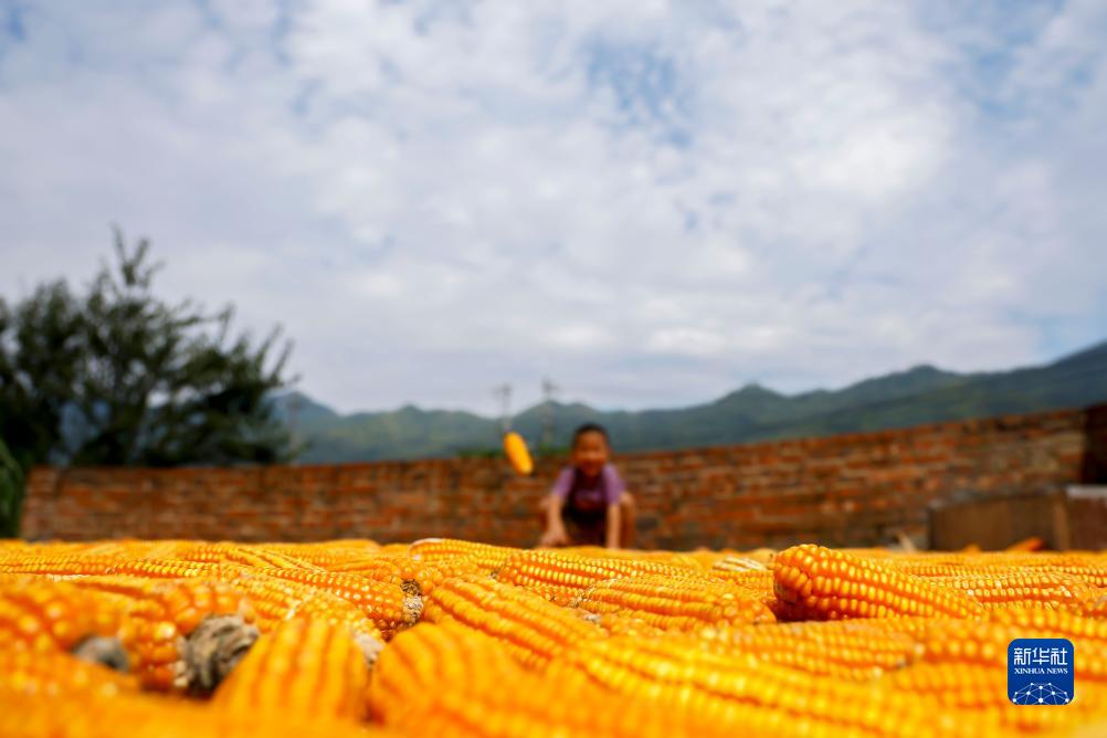 9月2日在贵州省黔南布依族苗族自治州罗甸县逢亭镇逢亭村拍摄的晾晒的玉米。新华社
