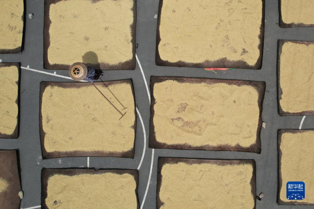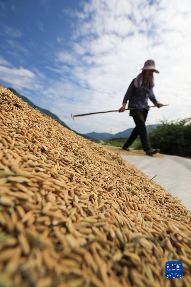 9月2日,村民在贵州省黔东南苗族侗族自治州从江县刚边壮族乡三联村晾晒稻谷。新华社