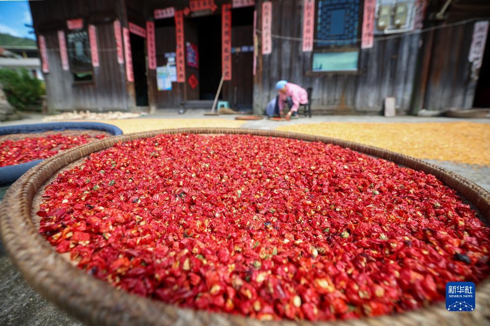 中国初秋时节,农作物相继成熟,人们忙着抢收、抢晒,到处是美丽的晒秋图景。
