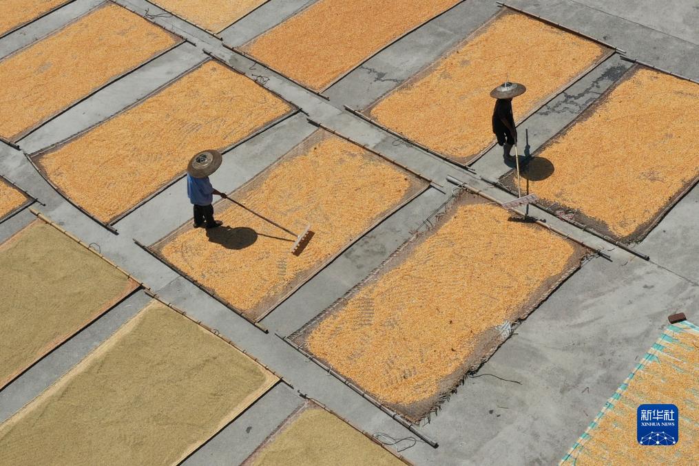 9月2日,村民在贵州省黔东南苗族侗族自治州丹寨县龙泉镇得禄村晾晒农作物。新华社