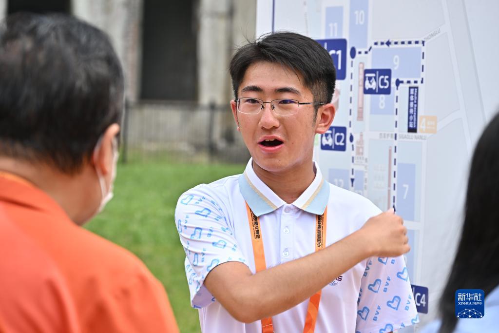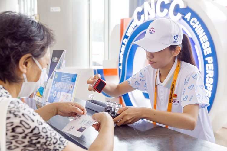 9月4日,来自北京外国语大学的志愿者为前来打卡的市民盖章。同时,她们还为中外来宾提供语言服务。“新京报”客户端