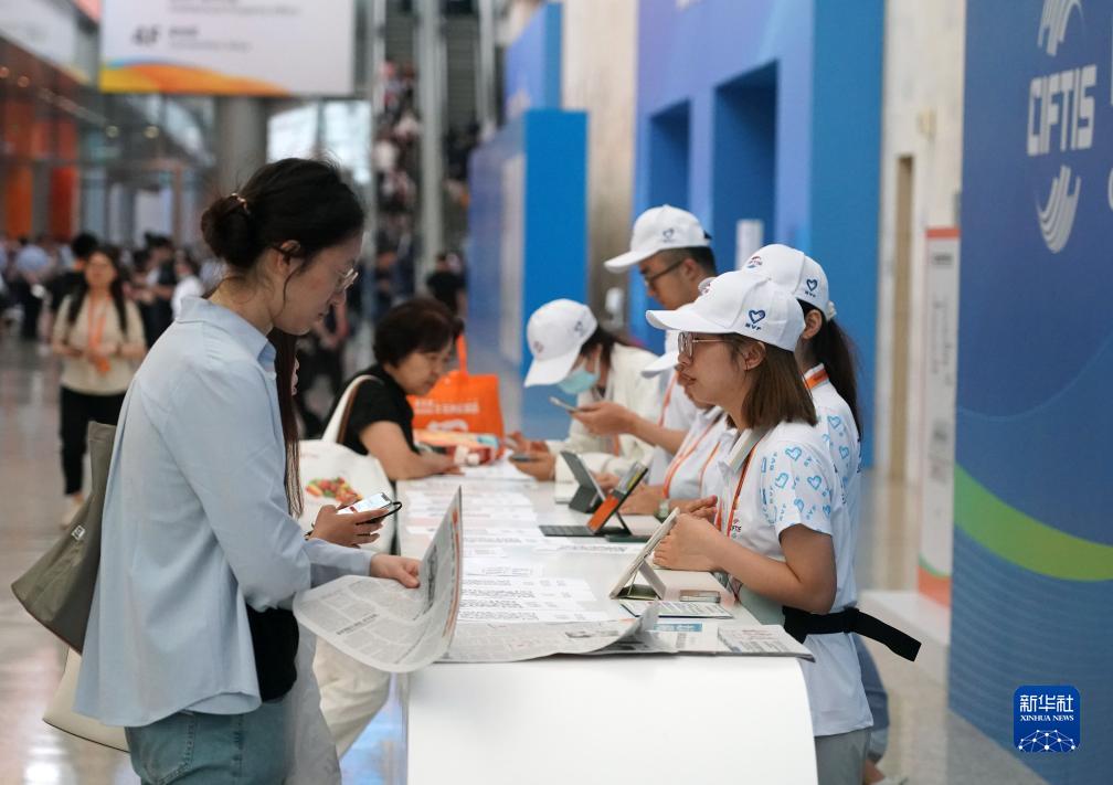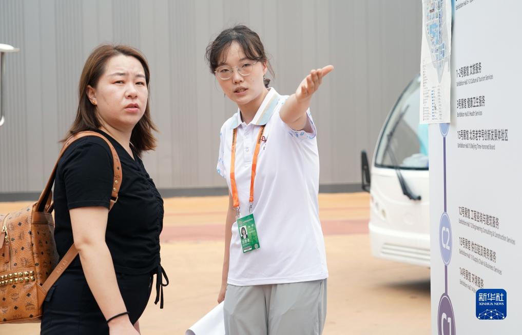 9月4日,在中国国家会议中心2023中国国际服务贸易交易会服务台,志愿者为嘉宾答疑解惑。“新京报”客户端