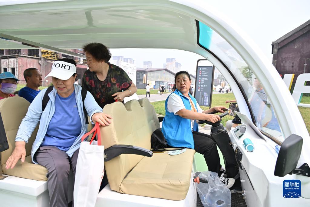 9月5日,摆渡车司机高现平提醒参观者下车时注意。新华社