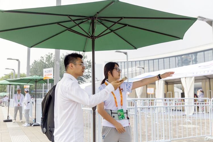 9月4日,中国国家会议中心入口处,北京交通大学的志愿者为观众指路。“新京报”客户端