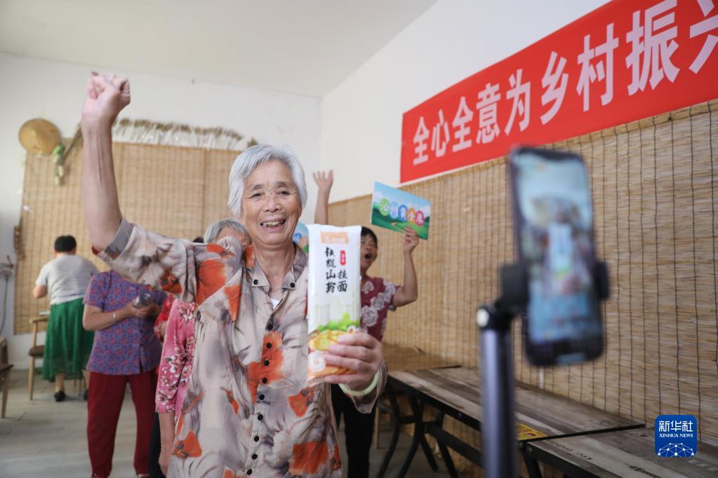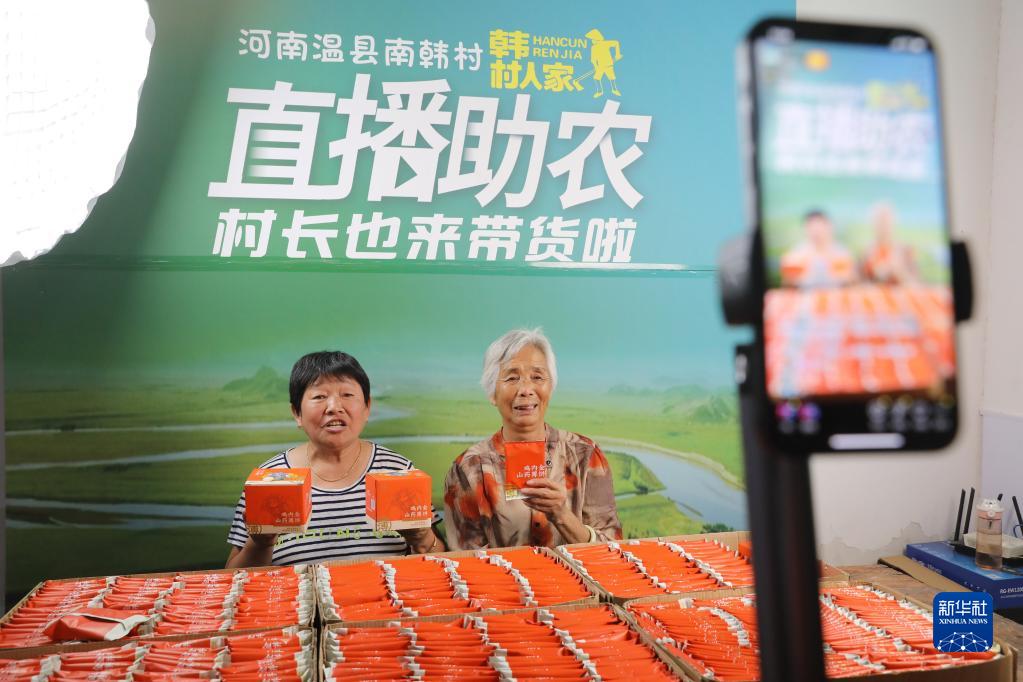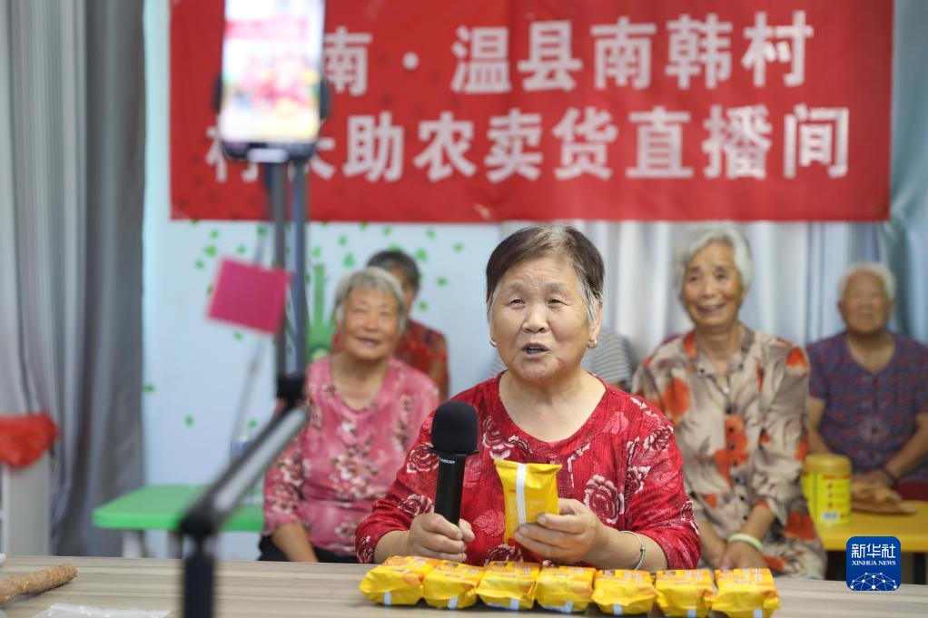 在河南省焦作市温县黄庄镇南韩村活跃着一支由十余名乡村老人组成的“银发直播团”,他们借助网络平台推介农产品,助力家乡农特产品“出村进城”。图为9月4日,在焦作市温县黄庄镇南韩村,几名老人在直播推介农特产品。新华社